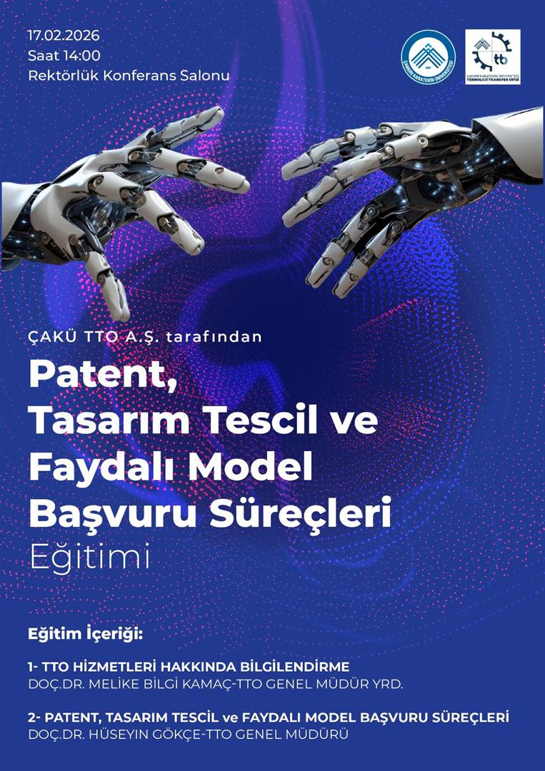 ÇAKÜ TTO A.Ş. tarafından düzenlenen “Patent, Tasarım, Tescil ve Faydalı Model Başvuru Süreçleri Eğitimi” 17 Şubat 2026 Salı günü saat 14:00’te Rektörlük Konferans Salonu’nda gerçekleştirilecektir.