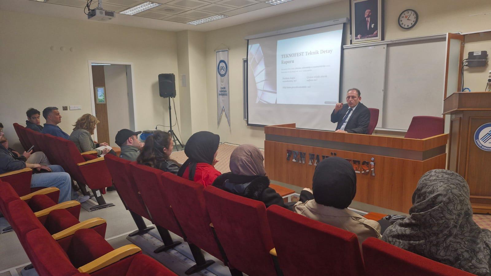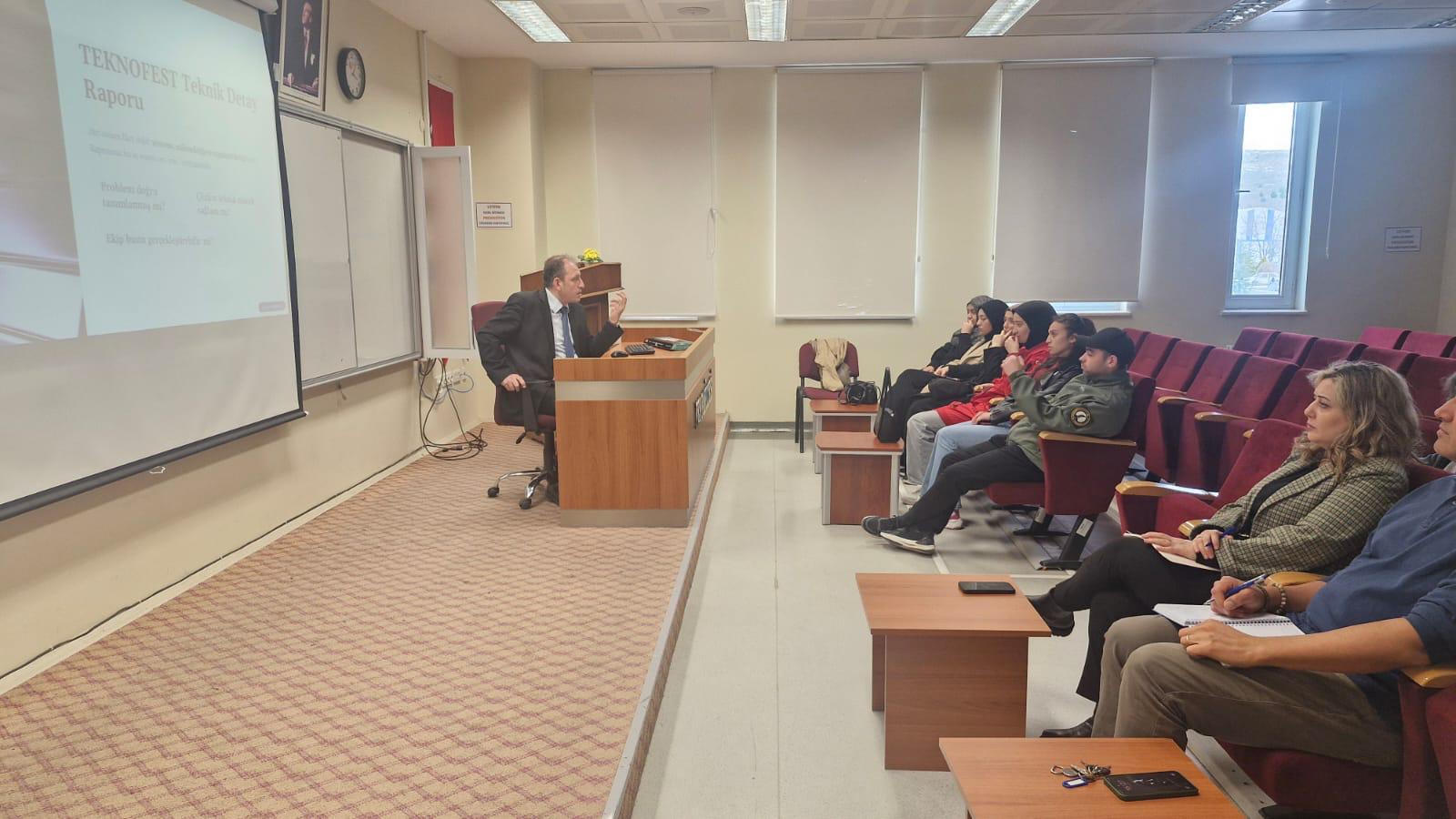 Etkinlik kapsamında, Teknokent Genel Müdürü Doç. Dr. Hüseyin GÖKÇE tarafından teknik detay raporu hazırlama süreçlerine ilişkin kapsamlı bilgiler paylaşıldı; yarışmalarda dikkat edilmesi gereken temel noktalar katılımcılarla ele alındı.